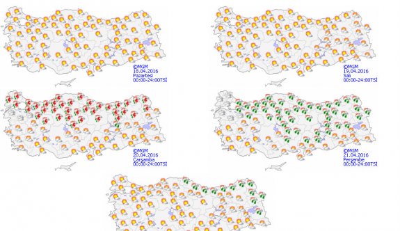 Meteoroloji Genel Müdürlüğü’nün 5 günlük tahminlerine göre; pazartesi ve salı günü Türkiye genelinde az bulutlu hava hakim olacak. Çarşamba günü kuzey bölgeleri gök gürültülü sağanak yağışlı, diğer yerler az bulutlu geçecek.Perşembe...