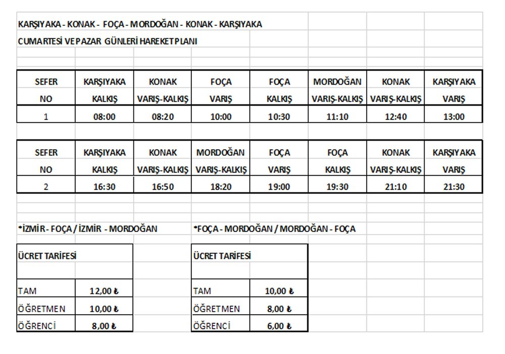 Cumartesi ve Pazar günleri sabah 08.00’de Karşıyaka’dan kalkan İZDENİZ gemileri, Konak iskelesinden de yolcu alıp önce Foça’ya, oradan Mordoğan’a geçiyor. Yolculuk, saat 13.00’te Karşıyaka iskelesinde son buluyor.
