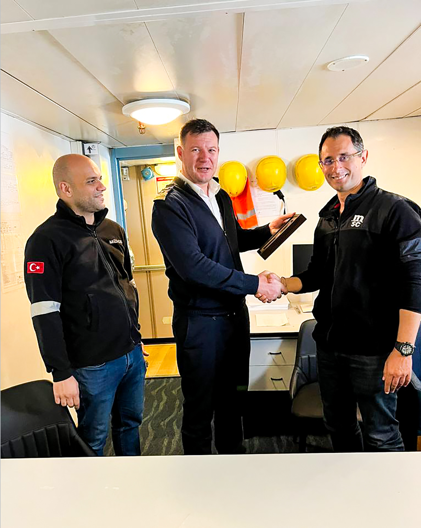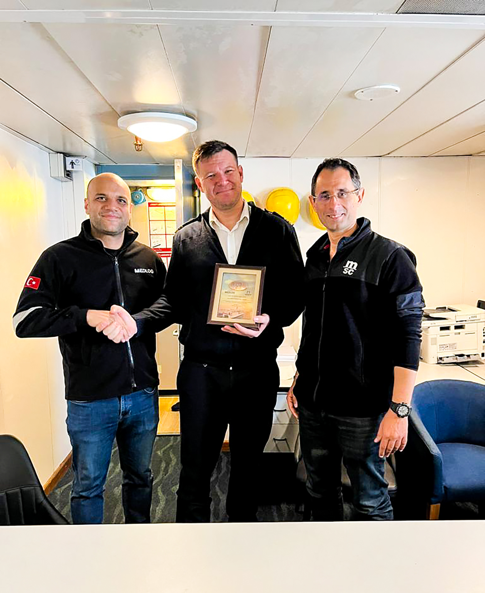 İskenderun’a veda eden gemiyi limana getiren ve kaldığı süre boyunca geminin güvenliğini sağlayan Kaptan Dumitru Rusu’ya deprem sürecindeki tüm yardımları ve özverili çalışmaları için teşekkür plaketi takdim edildi. Kaptan, plaketini MSC Mersin Bölge Müdürü Uğur Tosuner ve Medlog Lojistik Mersin Bölge Müdürü Necati Mürşitoğlu’nun elinden aldı.