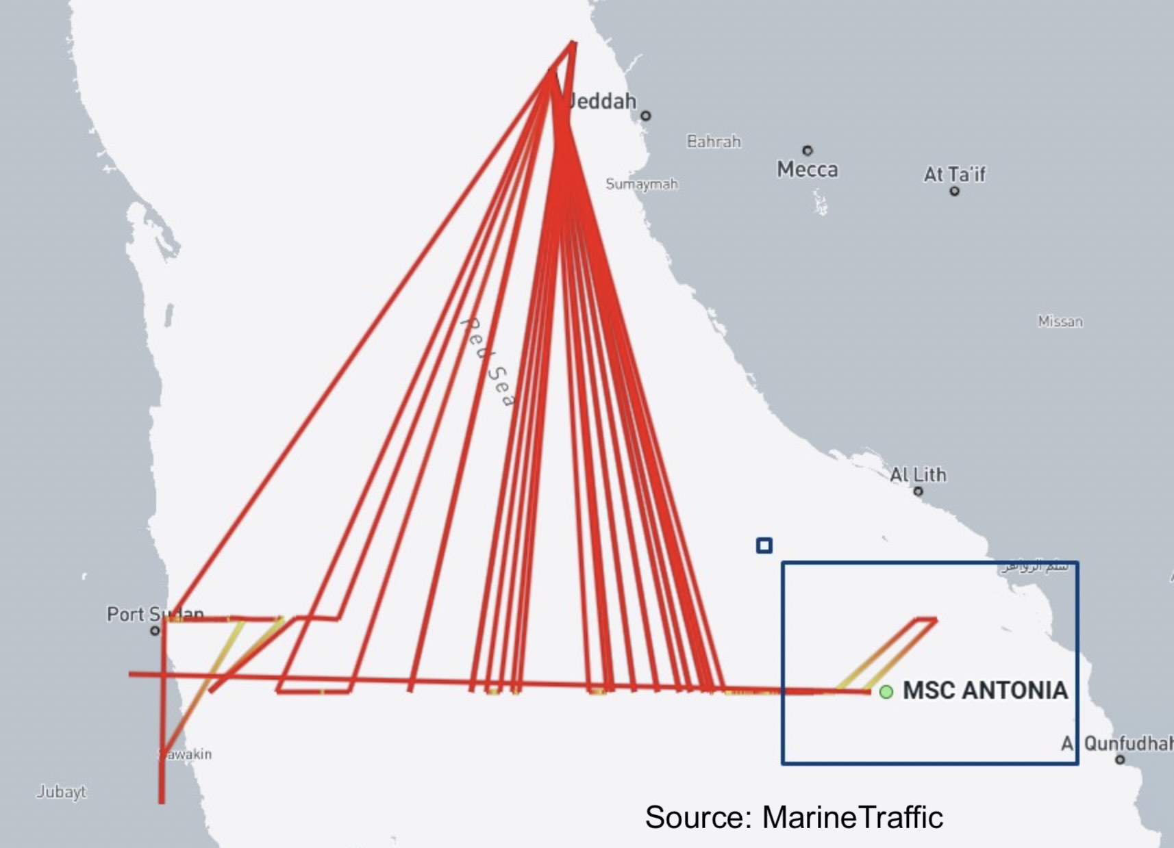 Cidde açıklarında karaya oturmasının üzerinden üç gün geçmesine rağmen, 7.000 TEU kapasiteli MSC Antonia hâlâ Kızıldeniz’de mahsur durumda. Gemi takip verileri, olayın muhtemelen GPS sinyal bozma (jamming) saldırısından kaynaklandığını ortaya koydu.