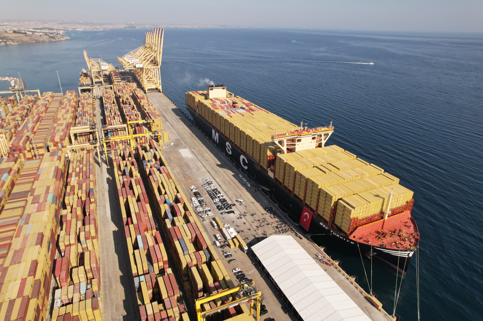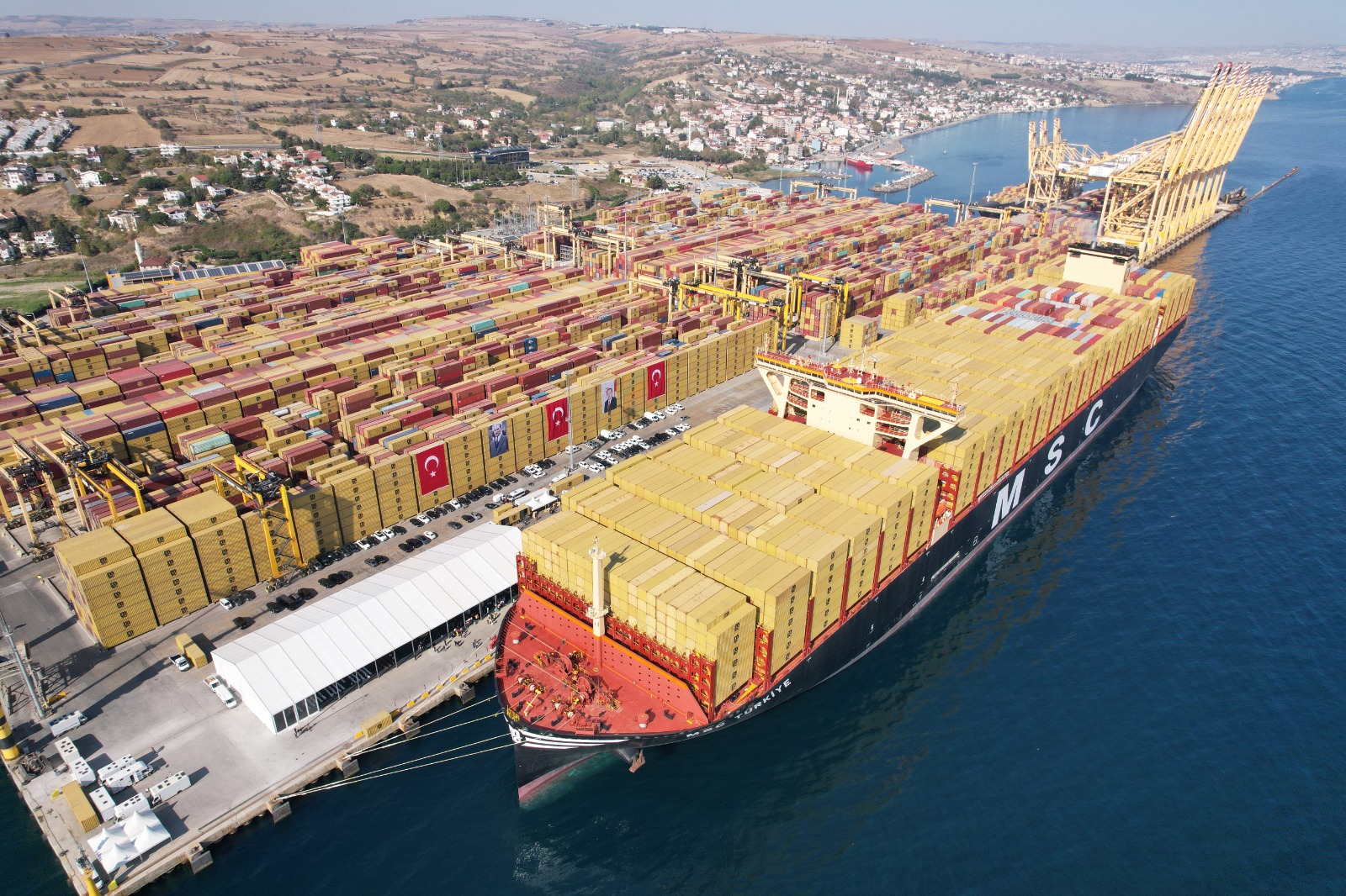 Çin'de inşa ettirilen, dünyanın en büyük 12 konteyner gemisinden biri olan ve Cumhuriyet'in kuruluşunun 100'üncü yıl dönümü nedeniyle 'MSC Türkiye' adı verilen gemi, Tekirdağ Asyaport Limanı'na yanaştı. MSC'nin İtalyan sahipleri Aponte ailesinin Çin'de inşa ettirdiği MSC Türkiye, 4 futbol sahası büyüklüğünde, 25 katlı apartman yüksekliğinde, 24 bin 346 konteyner taşıma kapasitesine sahip gemi Tekirdağ'da törenle karşılandı.