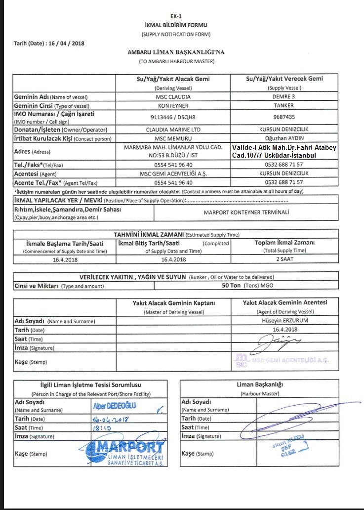 Tüm bunlara rağmen yaşına hürmetle Abi diye hitap ettiğim Altan beyi arayıp konuşmak istedim “BEN DEVLETİM İSTERSEM SENİ BURAYA SOKMAM" dedi ancak ben HEPİMİZİN ODASI ruhu ile seçimin hemen ardından bir şikayette bulunmadım. Şimdi görüyorum ki, kendini DEVLET yerine koymaya kalkan bu haddini bilmez mantalite ülkemize zarar verecektir, Devlet bize destek olurken önümüzü açar ve büyük miktarda döviz kazandıran bu ticaretin gelişimini planlarken bu köhne çağdışı zihniyet engel olmaya çalışmaktadır. Olayın detaylarına gelince, müşterimiz 16.04.2018 gunu saat 17:30 da aynı gece Ambarlı limanında MV MSC CLAUDIA gemisine ikmal edilmek üzere acil yakıt talep etmiş, bu hızda başka hiç kimse yapamadığı için siparişi firmamıza vermiştir. Cari kanunlara uygun belgelerle ve Liman Kanunun emrettiği tüm işlemleri yerine getirerek Gebze depolarımızdan yükleyerek yakıtı gece yarısı gibi hazır ettik ancak Arpaş kulenin haksız ve mesnetsiz engellemesiyle tankerimiz yakıtı vermek üzere geminin bulunduğu Marport iskelesine girişine izin verilmemiştir, konuya 02:00 de müdahalemle Arpaş haksız eyleminden geri adim atarak MT DEMRE 3 isimli tankerimiz gemiye yanaşarak yakıt ikmalini gerçekleştirilmiştir, yakıtın gemiye verilemediği bilgisi yalandır maksatlıdır.
