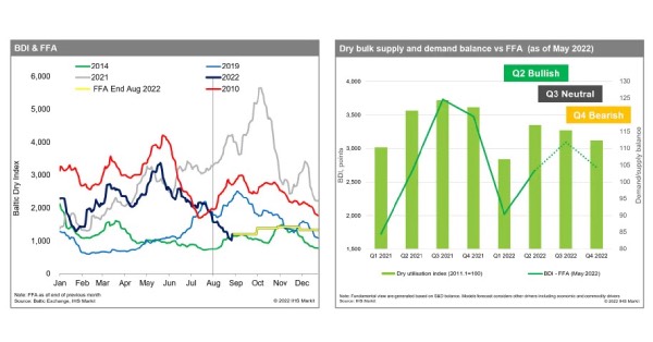 2022'nin üçüncü çeyreğinin başlarındaki kısa bir toparlanmanın ardından kuru yük gemileri kazançları son üç ayda düşmeye devam etti. Mevsimsellik modeli, piyasanın düşük senaryosu olarak gözlemlediğimiz 2014'e düştü (baz senaryo olarak 2010). mevsimsel eğilim). Pazarın tipik mevsimselliği, Mayıs 2022'nin sonundaki FFA değerlendirmesinde de görülebileceği gibi, kuru navlun oranlarının 2022'nin üçüncü çeyreğinde tekrar zirve yapacağını gösteriyor; ancak, önceki FRF uzun vadeli görünümüne (Mayıs 2022) ilişkin temel analizimiz ve tahminimiz, ikinci çeyreğin 2022'nin zirvesi olacağını gösterdi. Bu nedenle, önceki baskıda, üçüncü çeyreğin sonraki bölümünden kaynaklanan birkaç aşağı yönlü riskin ana hatlarını çizdik. dahil olmak üzere 2022: