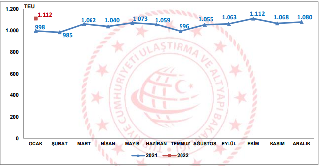 Denizcilik Genel Müdürlüğü Ocak 2022 konteyner istatistiklerini açıkladı. 2022 yılı Ocak ayında limanlarımızda elleçlenen konteyner miktarı bir önceki yılın aynı ayına göre %11,4 artarak 1 milyon 111 bin 995 TEU olarak gerçekleşti.