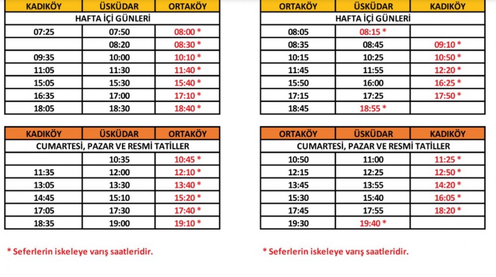 İstanbul Büyükşehir Belediyesi Şehir Hatları ,17 Mayıs 2021 tarihiyle Üsküdar-Ortaköy hattına Kadıköy durağını da ekliyor.17 Mayıs 2021 pazartesi günü başlayacak sefer tarifeleri şu şekilde olacak:
