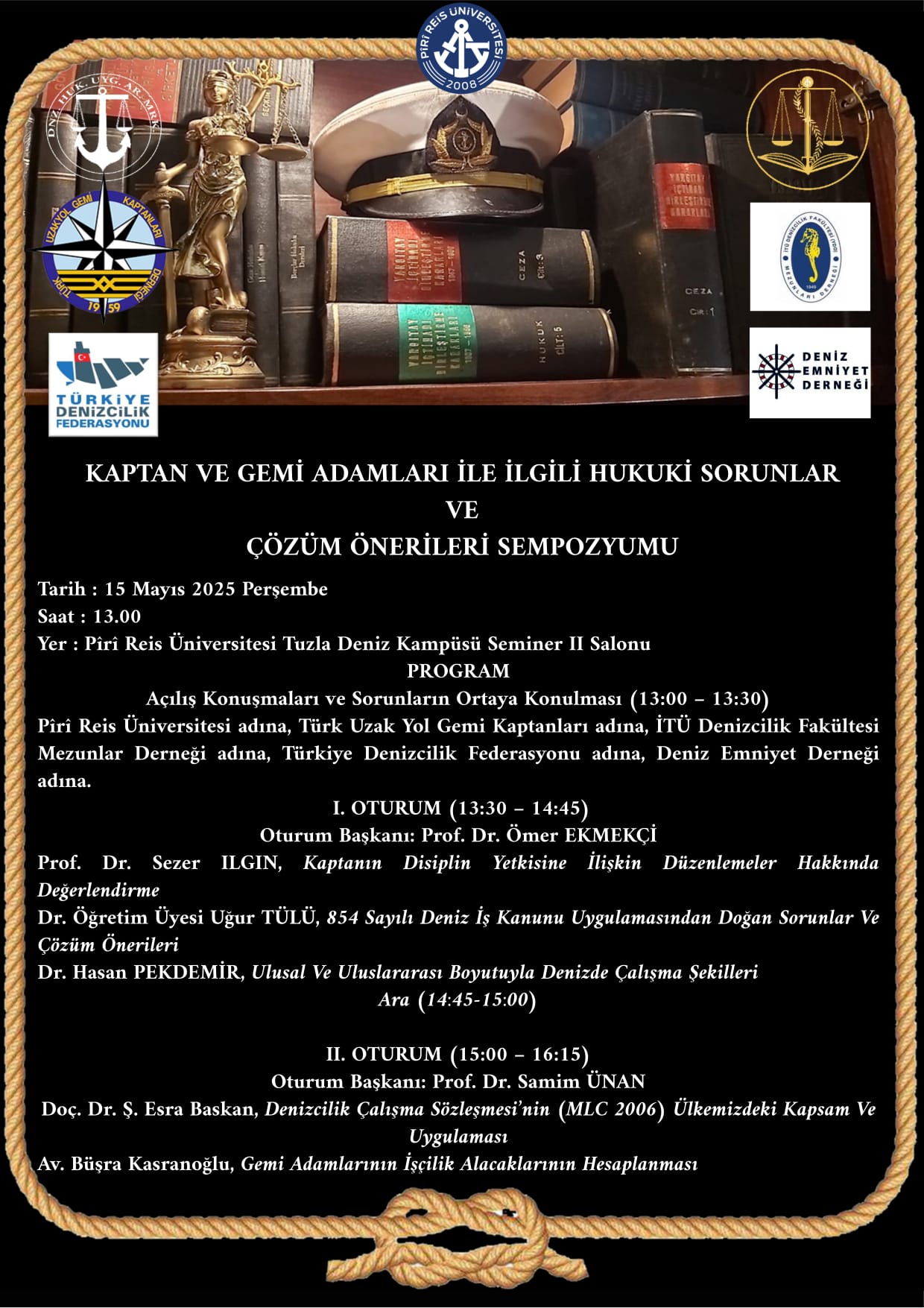 Türkiye’nin denizcilik hukuku gündemini akademik bir çerçevede ele almayı amaçlayan “Kaptan ve Gemi Adamları ile İlgili Hukukî Sorunlar ve Çözüm Önerileri Sempozyumu” 15 Mayıs 2025 Perşembe günü Piri Reis Üniversitesi Tuzla Deniz Kampüsü Seminer II Salonu’nda gerçekleştirilecek .