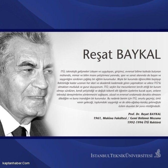Mühendishane-i Bahri Hümayun’dan İTÜ Gemi İnşa ve Deniz Bilimleri Fakültesine Gemi inşaatı ve Deniz Teknolojisi Mühendisliği tarihi yazarı Prof Dr Reşat Baykal 1938 yılında Ardahan'da doğdu. Ilk ve orta oğrenimini Ardahan'da tamamladı. Ankara Atatürk Lisesi'ni 1956 yilinda bitirip aynı yıl girdiği İTÜ Makine Fakültesi Gemi §ubesi'nden Haziran 1961'de Y.Müh. unvaıiyla mezun oldu. Askerlik hizmetini 1961-1963 döneminde Deniz Kuvvetleri'nde yaptı. Eylül 1963'te Makine Fakültesi Gemi Şubesi'nde asistanlığa başladı. 1968'de Doktor, 1974'te Docent, 1980'de Profesör oldu. CENTO Bursunu kazanarak 1969-1971 yıllarında Glasgow Strathclyde Üniversitesi'nde, Eylül 1975-1976'da Hannover Teknik Universitesi'nde arastırmacı olarak görev yaptı. Ağustos 1980 yılında seçildiği Gemi insaati ve Deniz Bilimleri Fakültesi Dekanlığını 12.10.1992 tarihine kadar aralıksız dört dönem sürdürdü. 1992-1996 döneminde seçilerek atandigi İTÜ Rektörlüğü gorevinde bulundu. İTÜ dışında; 1976-1984 döneminde Deniz Harp Okulu'nda ders verdi. 1966-1969 yıllarında Gemi Miihendisleri Odası, 1987-1992 de Türkiye Gemi Sanayii, 1997-2000 de TDİ - Türkiye Denizcilik İşletmeleri'nde Yönetim Kurulu Üyeliği, 2000-2002 de TDİ Yönetim Kurulu Başkanlığında bulundu. 1992'den beri ABS-Amerikan Loydu Avrupa Grubu, 2008'den itibaren de ABS Karadeniz Grubu Teknik Komite Uyeliği görevlerini sürdürmektedir. Yayımlanmış tezleri dışında; 8'i telif, 3'u çeviri ve 3’ü de konferans yayını olmak iizere toplam 14 kitabı, makale, teblig, araştirma ve uygulamalı çalışma türünde 80 yayını vardır.