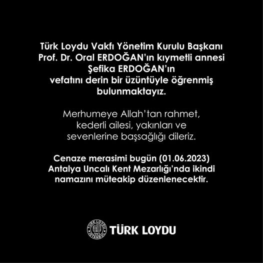 Türk Loydu Vakfı Yönetim Kurulu Başkanı Prof.Dr.Oral Erdoğan'ın annesi Şefika Erdoğan vefat etmiştir,