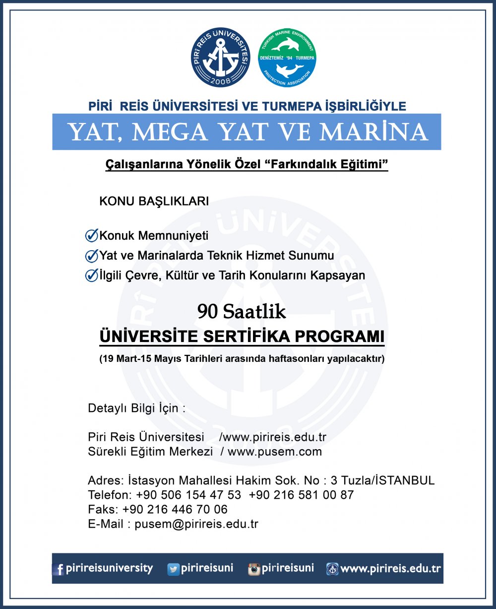 YAT, MEGA YAT ve MARİNA ÇALIŞANLARINA YÖNELİK hazırlanan özel farkındalık eğitimini kapsayan sertifika programı, 19 Mart’ta Piri Reis Üniversitesi Sürekli Eğitim Merkezi’nde başlıyor. Hazırlanan sertifika programı ile yat kaptanlığı ehliyeti almış kaptanların teknik hizmet sunumunu geliştirme, yat ve marinalarda konuk memnuniyetini artırmanın yanı sıra katılımcılarda denizlerin ve çevrenin korunması konusunda farkındalık yaratmak da amaçlanıyor. Böylece sürdürülebilir ekosistem ve turizm için sektörde bilinçli ve çevreye duyarlı bireylerin yetiştirilmesi sağlanacak.