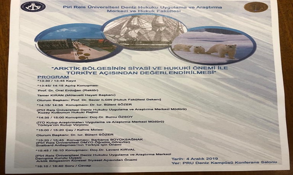 Piri Reis Üniversitesi Deniz Hukuku Uygulama ve Araştırma Merkezi ve Hukuk Fakültesi 4 Aralık 2019 Çarşamba tarihinde, “Arktik Bölgesinin Siyasi Ve Hukuki Önemi İle Türkiye Açısından Değerlendirilmesi" başlığında düzenlenecek panelin açılış konuşmaları PRÜ Rektörü Prof. Dr. Oral Erdoğan, IMEAK DTO Yönetim Kurulu Başkanı ve PRÜ Mütevelli Heyet Başkanı Tamer Kıran ve Prof. Dr. Sezer Ilgın (Hukuk Fakültesi Dekanı) tarafından gerçekleştirilecek.