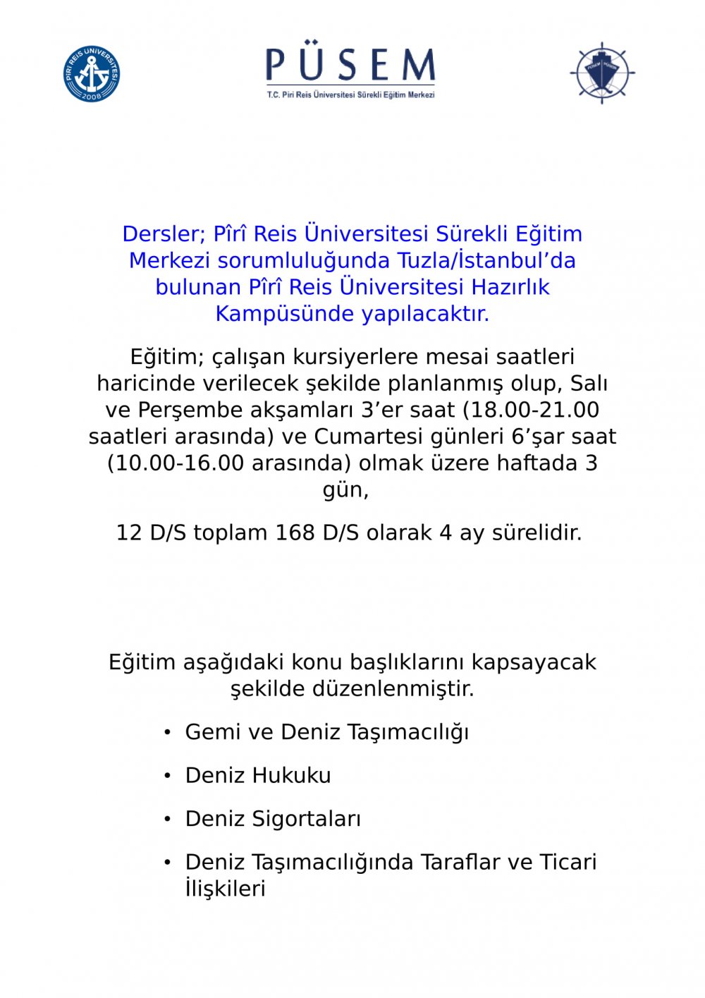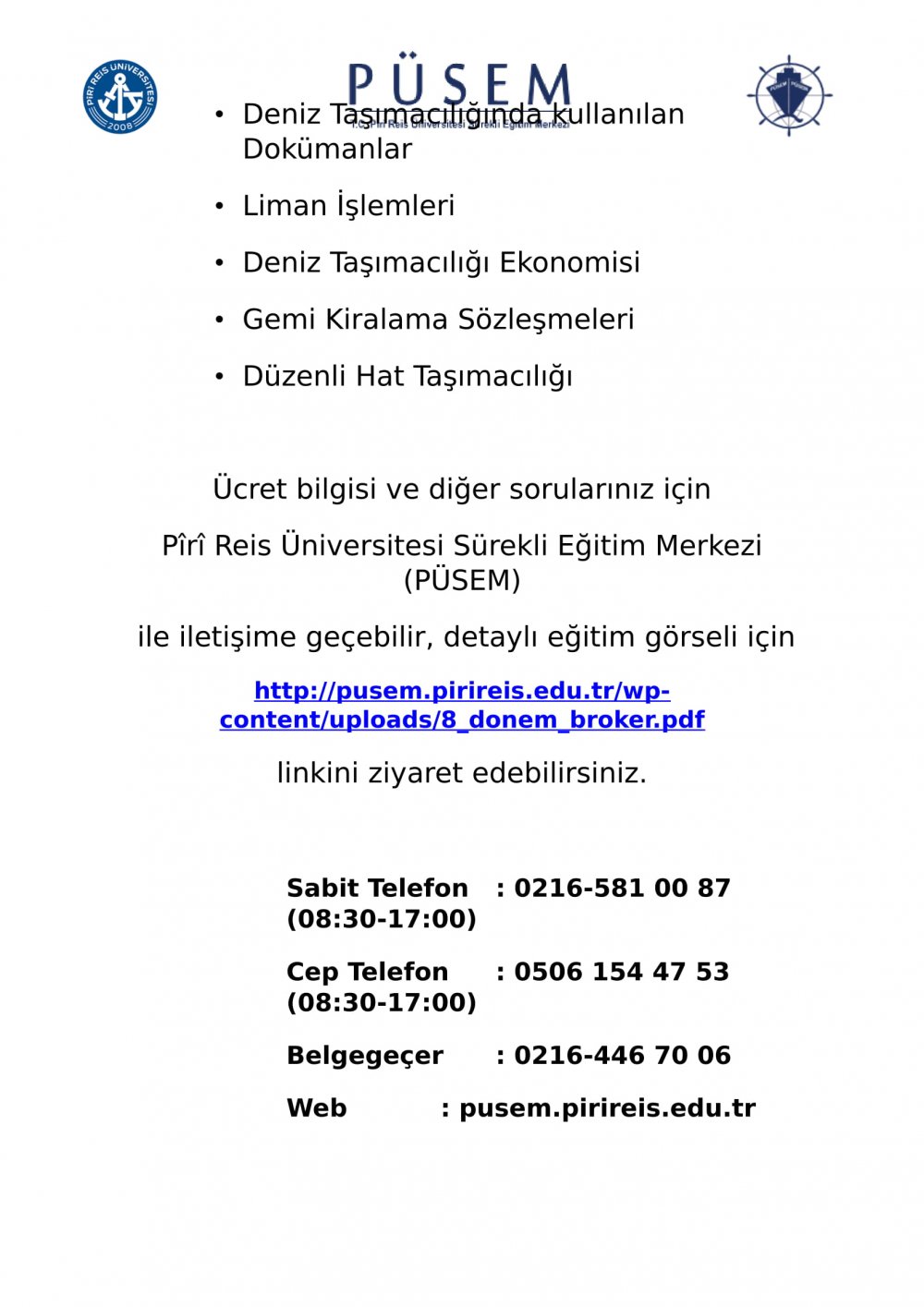 Piri Reis Üniversitesi Sürekli Eğitim Merkezi (PÜSEM)'de 8. Dönem “Gemi Kiralama ve Brokerlik Kursu" başlıyor. En az lise mezunlarının başvuru yapabileceği kurs 24 Eylül 2019 – 28 Aralık 2019 tarihleri arasında yapılacak.