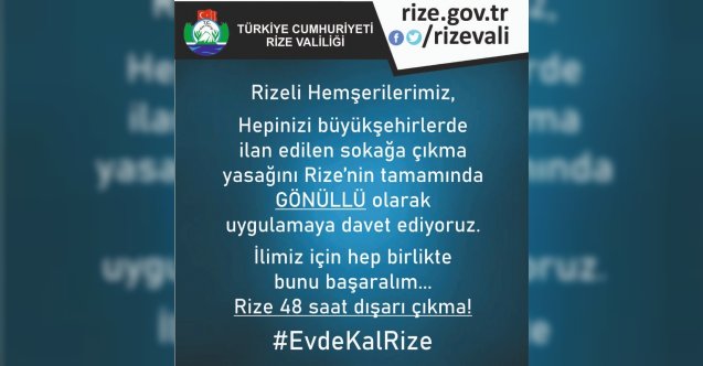 Rize Valiliği, İçişleri Bakanlığı tarafından 30 büyükşehir ve Zonguldak’ta bu gece yarısından itibaren başlatılan sokağa çıkma yasağının Rize’de gönüllü olarak uygulanmasına davet etti. Rize Valiliği’nin sosyal medya hesabından yapılan paylaşımda "Değerli Rizeli Hemşerilerimiz, İçişleri Bakanlığınca büyükşehirlerde ilan edilen sokağa çıkma yasağını Rize’nin tamamında ’GÖNÜLLÜ’ olarak uygulamaya davet ediyoruz. İlimiz için hep birlikte bunu başaralım. Rize, 48 saat dışarı çıkma!" ifadelerine yer verildi.