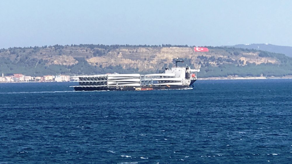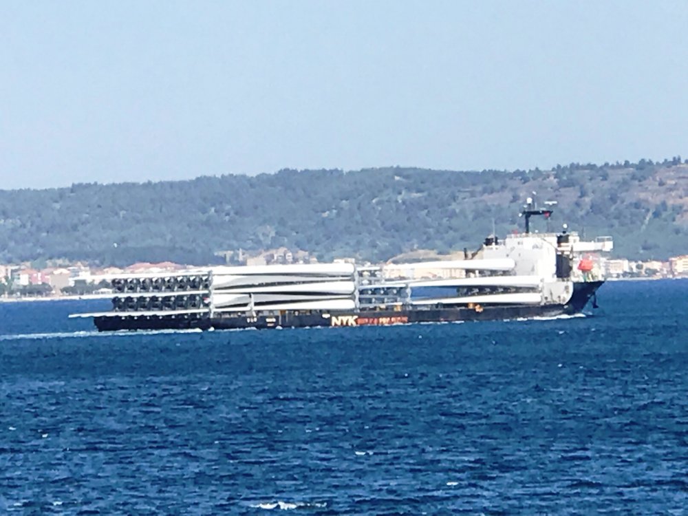 Her biri 58 metre ve 15 ton ağırlığında olan dev rüzgar türbini kanatları taşıyan 262 metre boyundaki Yamatai isimli gemi Çanakkale boğazından geçti 36 millik boğaz geçişini 4 saatte tamamlayan gemi türbin kanatlarını Malta’dan Ukrayna’ya götürüyor.