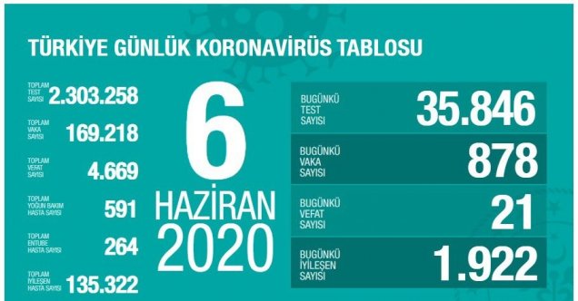 Sağlık Bakanlığından yapılan açıklamaya göre, son 24 saatte 21 kişi korona virüsten hayatını kaybetti, toplam can kaybı ise 4 bin 669’e yükseldi. Bugün toplam 35 bin 846 test yapılırken, 878 yeni vaka tanısı konuldu, toplam vaka sayısı ise 169 bin 218 oldu. Bugünkü bin 922 kişiyle birlikte toplam iyileşen sayısı da 135 bin 322’e yükseldi. Toplam entübe hasta sayısının 264, toplam yoğun bakım hasta sayısının ise 591 olduğu açıklandı.