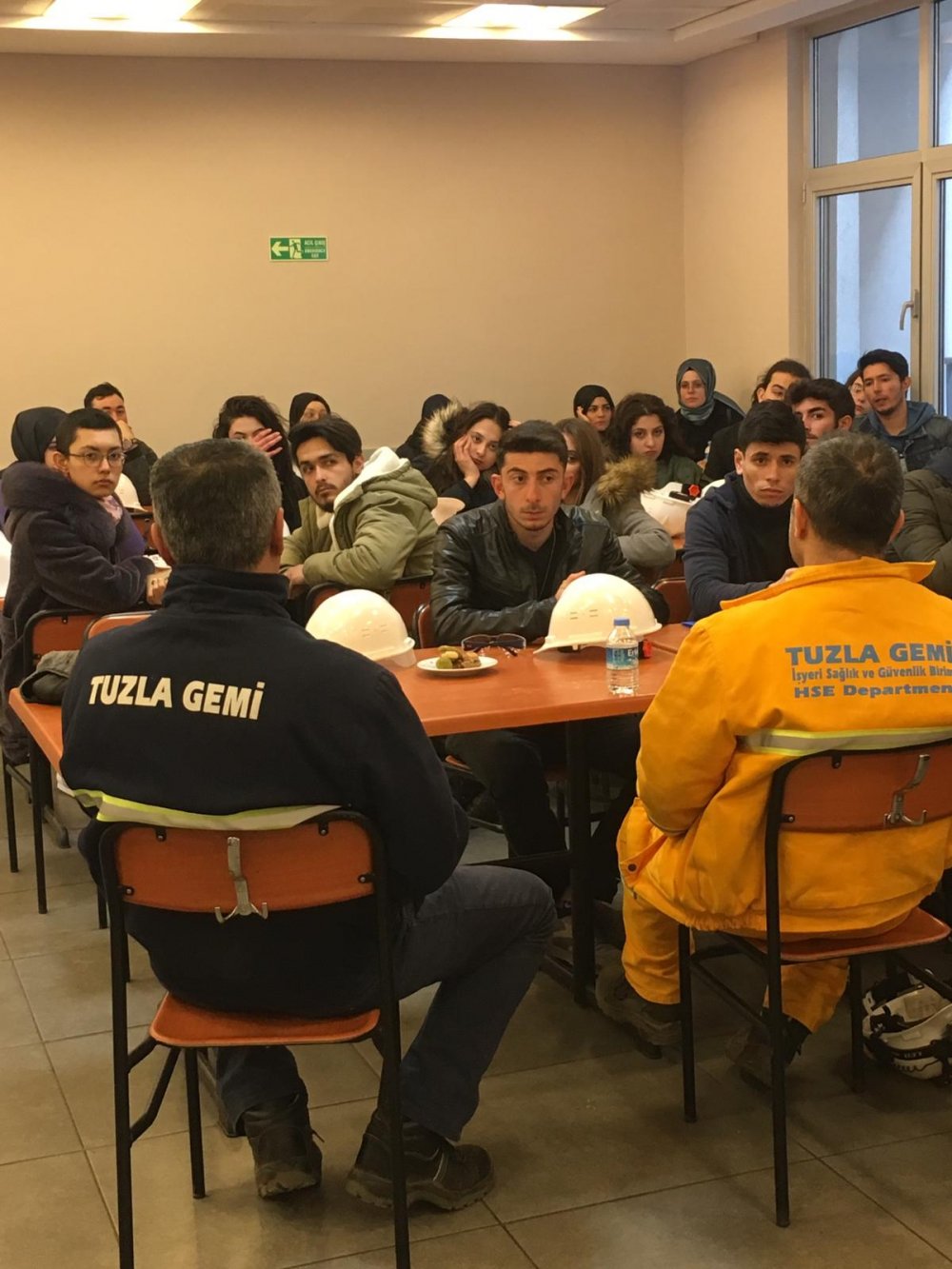 Karşılamaya müteakip hemen ziyaretçiler sağlık ve emniyet ile ilgili brifing ve eğitimi için salona alındılar. Sağlık ve emniyet eğitimlerine müteakip, tüm öğrenciler ve Öğr.Elemanı sağlık ve emniyet ile ilgili kişisel koruyucu ekipmanlarını giymiş bir şekilde Genel Müdür liderliğinde sahada sağlık ve emniyet ile ilgili uygulamaları bizzat yerinde görebilme şansına sahip olmalarının yanında, tersanede bakım-tutum için havuzda bulunan 300m boyunda bir konteyner gemisini de görme fırsatı yakaladılar. Öğrenciler bu kadar büyük bir gemiye verilen sağlıklı ve emniyetli çalışma ortamından çok etkilendiler. Bunun yanında tüm kaynak, boru imalat ve tamir atölyelerindeki çalışmalar ile gantry kreynleri ve operasyonlarını görebilme fırsatını buldular. Ülkemizin sağlık temalı ilk köklü üniversitesi olan Sağlık Bilimleri Üniversitesi öğrencileri tersanede bulunan sağlık tesisini de görerek, tersane teknik ziyaretini tamamladılar.