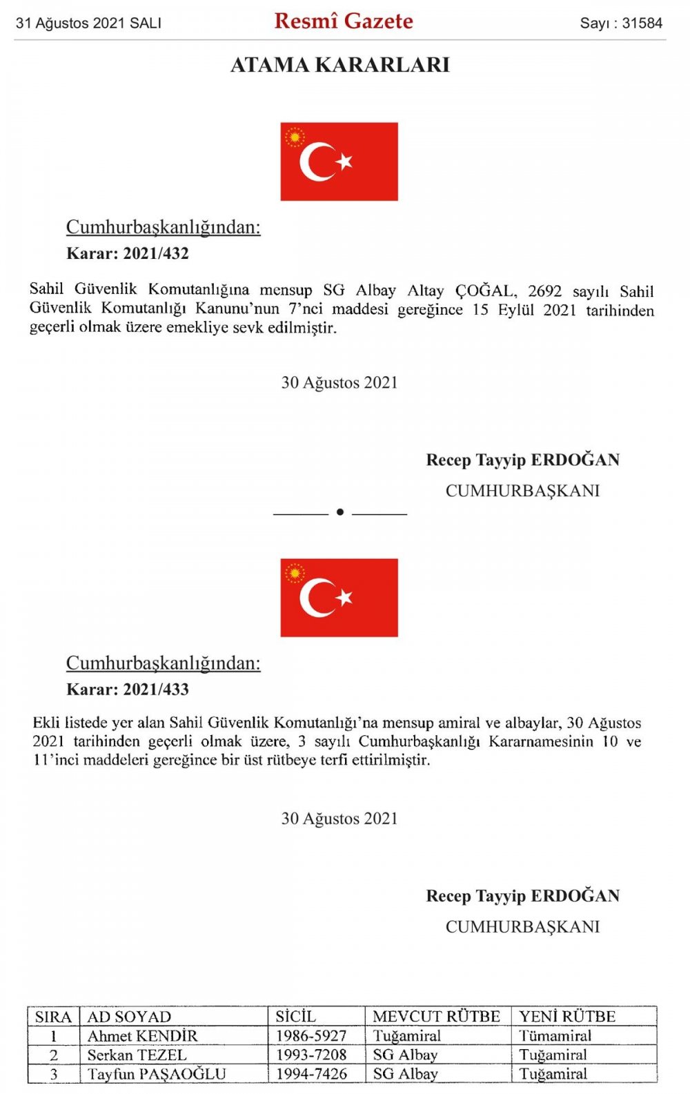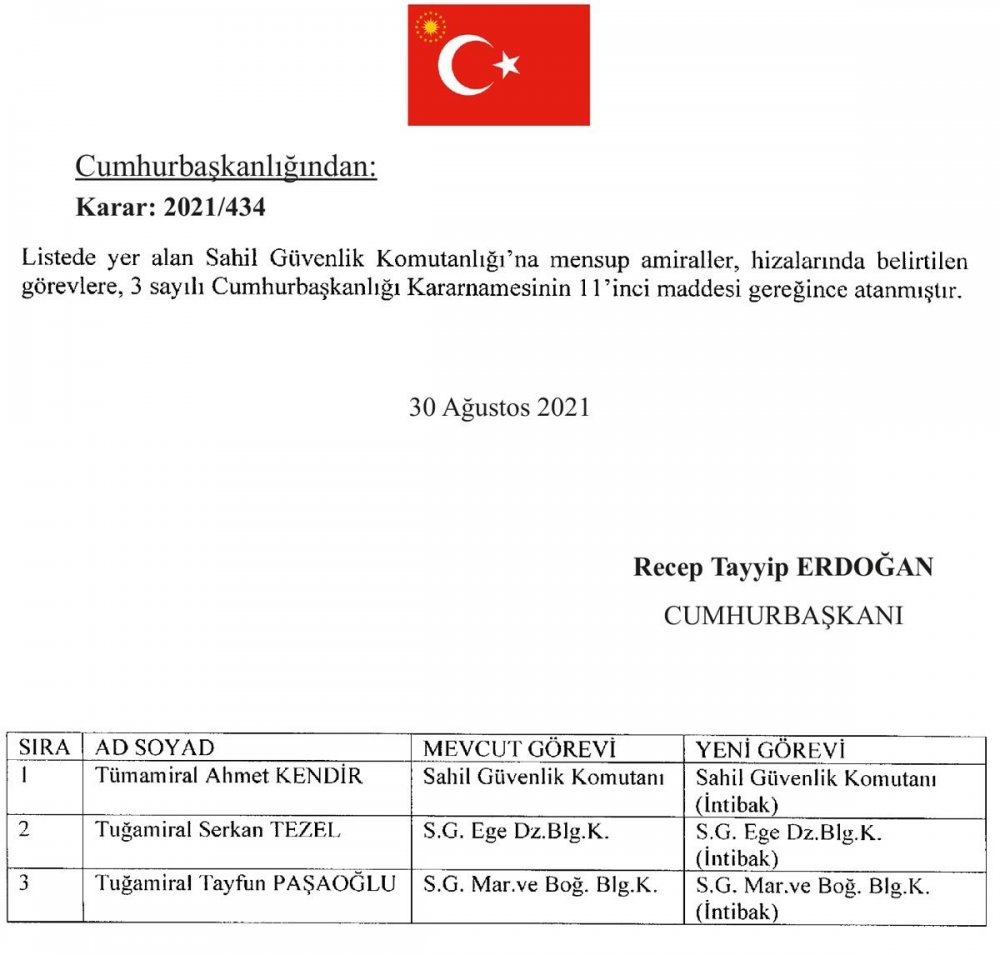 Resmi Gazete'de yayımlanan atama kararlarına göre Tümamiral Ahmet Kendir Sahil Güvenlik Komutanı, Tuğamiral Serkan Tezel Ege Deniz Bölge Komutanı, Tuğamiral Tayfun Paşaoğlu Marmara ve Boğazlar Bölge Komutanı oldu.