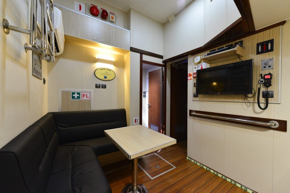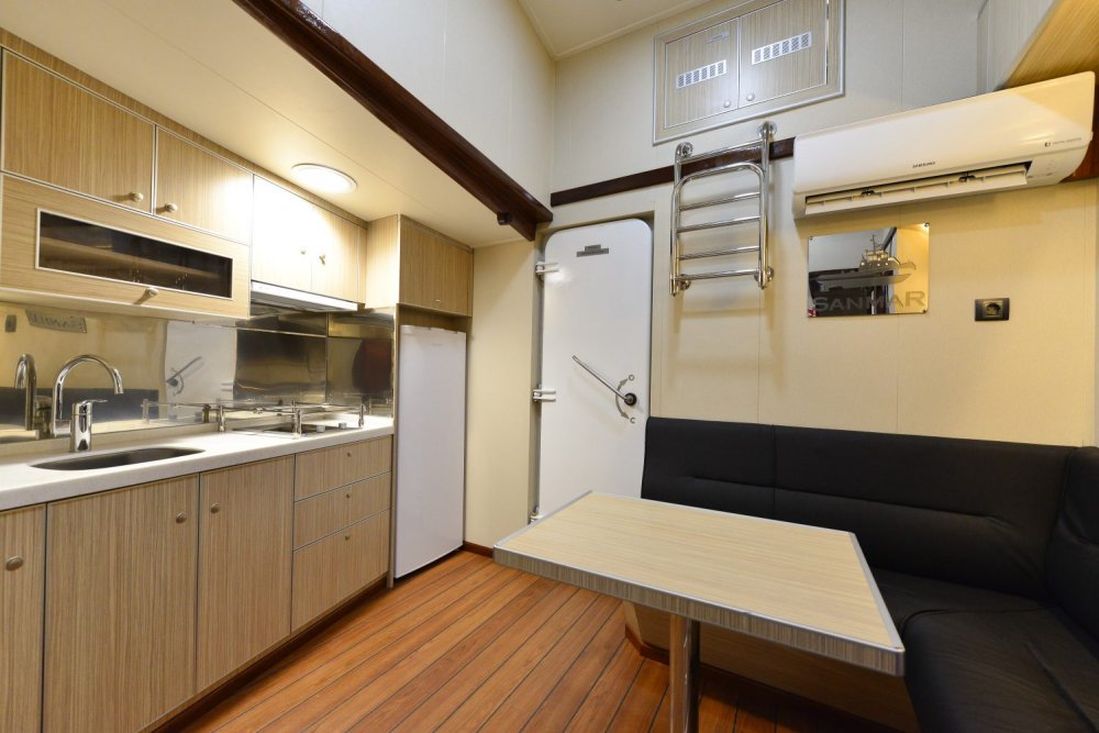 İki kabin, kiler, salon, duş içeren tuvalet odası da dahil olmak üzere üç kişilik bir ekip için konaklama imkanı yer almaktadır.