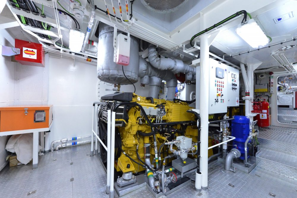 Tahrik sistemi ikiz 650 kW Caterpillar C18, Reintjes 5.5: 1 geri / redüksiyon dişlileri, 120 mm paslanmaz çelik mil ve # 37 nozullarda 1450 mm 5 kanatlı pervanelerden oluşmaktadır. İkiz yüksek oranlı dümenleri her bir nozulun arkasına yerleştirilmiştir. Yakıt sistemi, aşağı çekildikçe trim üzerinde minimum etkiye sahip olacak şekilde merkezi olarak konumlandırılan, kanat tankları iskele ve sancak olmak üzere 2 tanklı bir sistemdir.