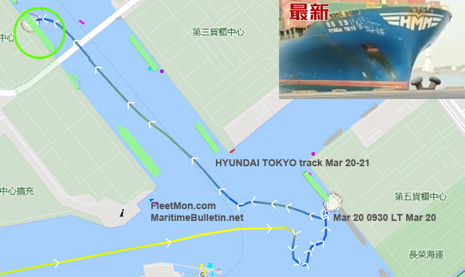 HYUNDAI TOKYO adlı konteyner gemisi, 20 Mart günü saat 0930'da tam yüklü olarak Tayvan, Kaohsiung Limanı'na yanaşırken iskeleye çarptı.