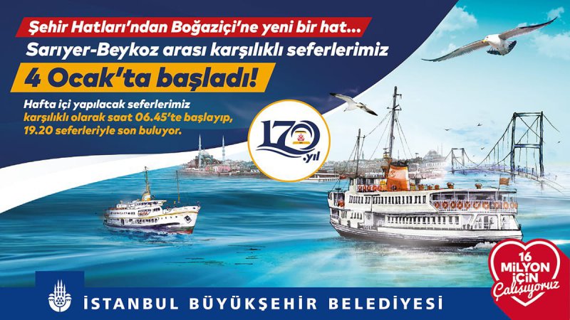 Şehir Hatları tarafından Boğaziçi’ne yeni bir hat açıldı. Beykoz – Sarıyer arasında karşılıklı seferler 4 Ocak 2020 tarihi itibariyle başladı. Hafta içi yapıalcak olan seferler karşılıklı olarak saat 06:45’te başlayıp saat 19:20 seferiyle son buluyor.