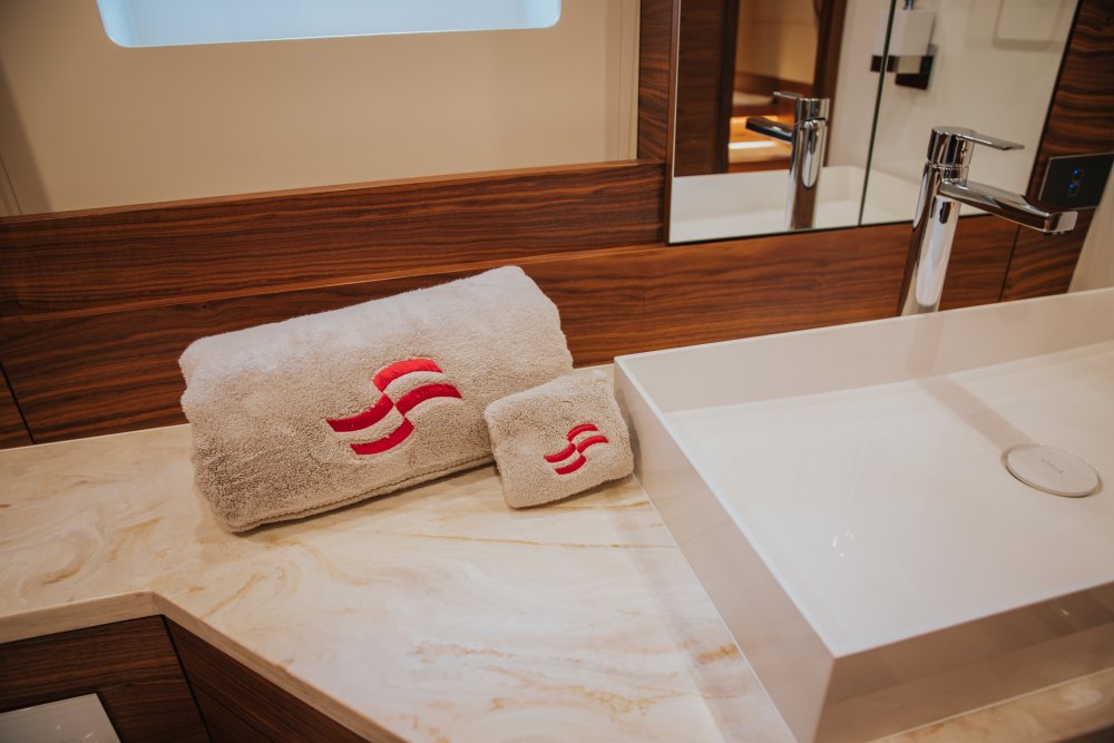 Alt güvertedeki ana kamara, gövdenin altı metre genişliğindeki tüm enine yayıldığından sahibine çok geniş ve kullanışlı bir alan sunuyor. King boy yatağın bulunduğu ana kamara gündüzleri kocaman camlardan içeriye dolan gün ışığıyla doluyor. Ana kamaranın kendine ait bir banyosu bulunuyor. Konukları ise her ikisi de kendi banyosuna sahip, ikiz yataklı bir misafir kamarası ile baş tarafta konumlandırılan VIP kamara ağırlıyor.