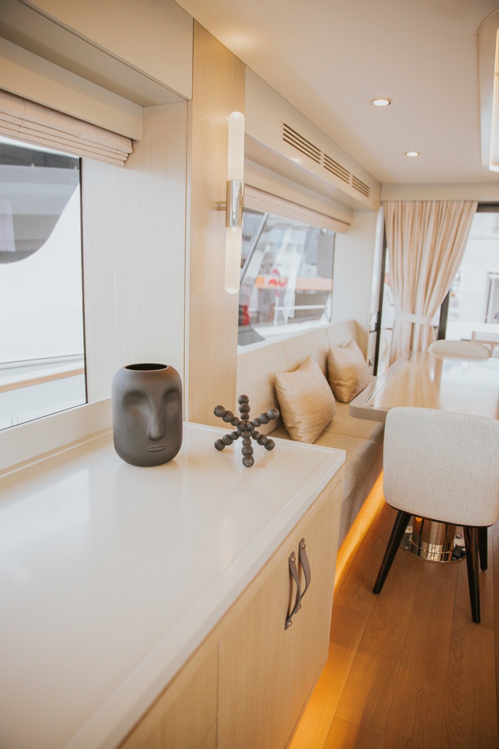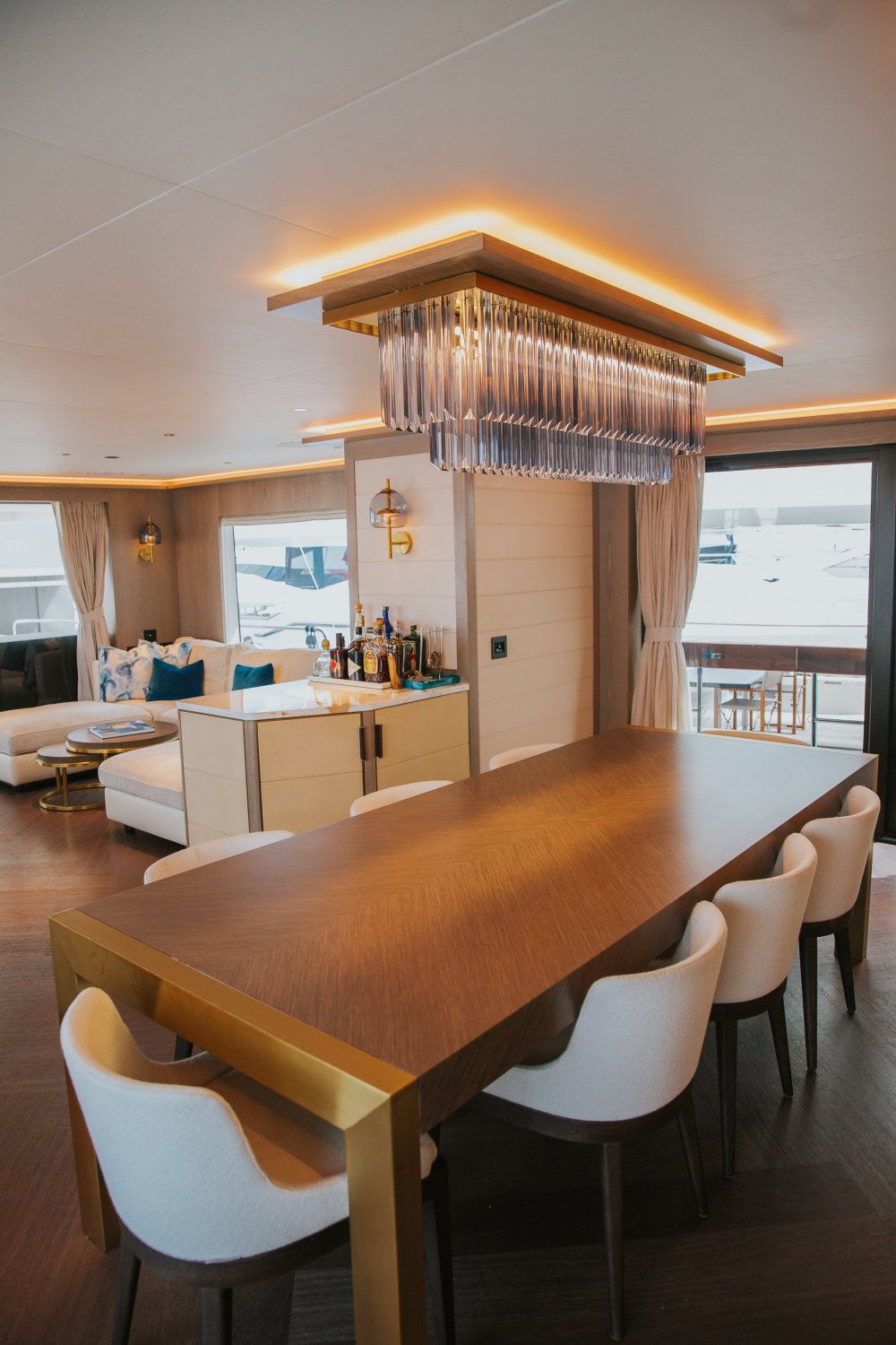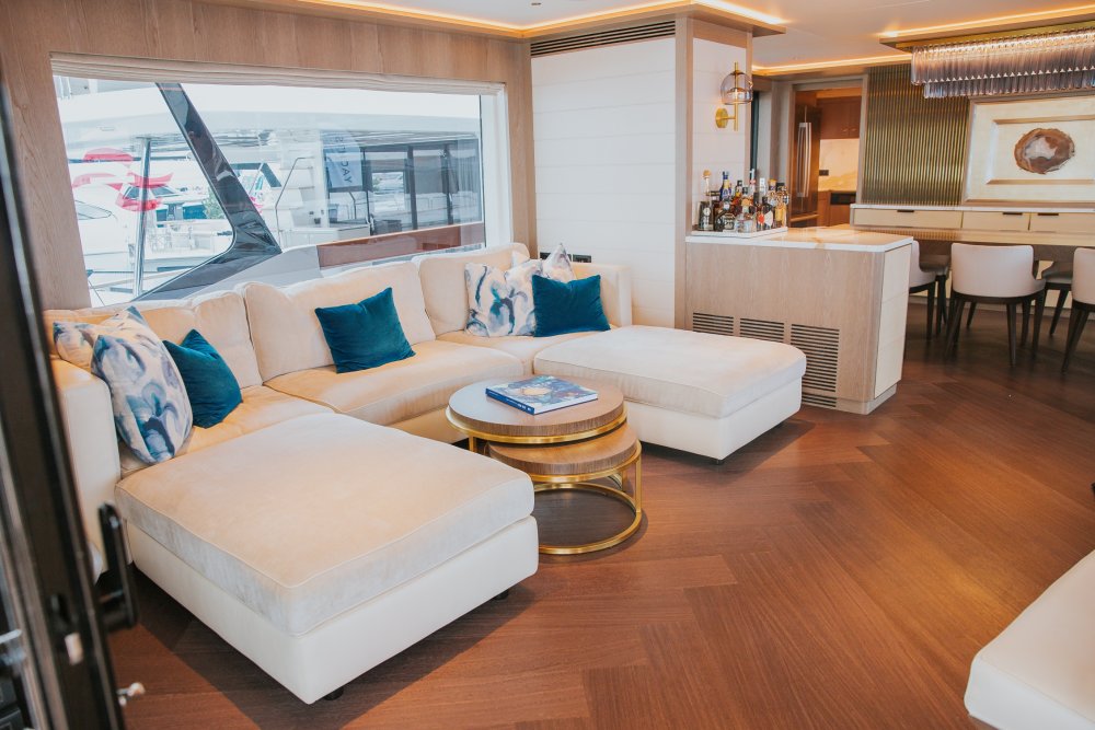 Sirena 68'e kıç güverteden girildiğinde misafirleri içerisinde geniş ve tam donanımlı açık mutfağın bulunduğu ferah bir salon karşılıyor. Salon ve mutfaktaki dev camlar, deniz manzarasını olduğu gibi içeriye taşıyor. Bu sayede içeridekiler zahmetsiz bir şekilde bulunduğu yerden deniz manzarasının tadını çıkarabiliyor. Dev camların yarattığı ışık oyunları salonu adeta bir açık alana çeviriyor.