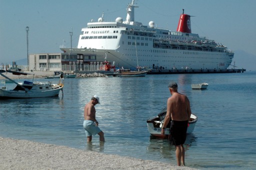 MALTA BAYRAKLI ''SKY WONDER'' YOLCU GEMISI BIN 200 ISPANYOL VE PORTEKIZLI YOLCUSUYLA BODRUM'A GELDI. YUNANISTAN'IN RODOS ADASI'NDAN BODRUM'A GELEN 208 METRE UZUNLUGUNDA VE 27 METRE GENISLIGINDEKI YOLCU GEMISI, BODRUM GEMI YANASMA ISKELESI'NE DEMIRLEDI. (AA)