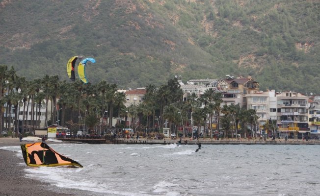 Muğla’nın Marmaris ilçesinde etkili lodosu fırsat bilenler soluğu sahilde aldı.