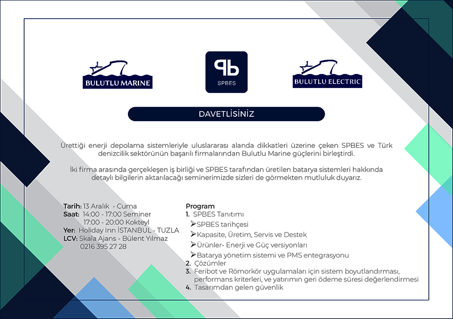 Bulutlu Marine, 13 Aralık tarihinde gerçekleştireceği seminerle SPBES ürünlerini Türk denizcilerine tanıtacak. Seminerde, SPBES tarafından üretilen batarya sistemleri hakkında katılımcılara detaylı bilgiler verilecek.