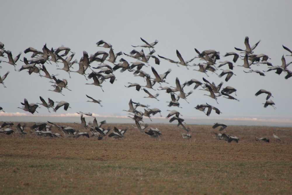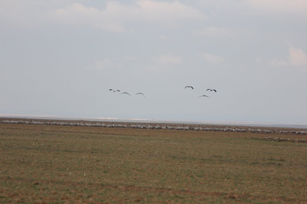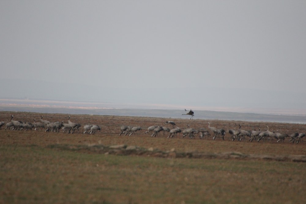 Buharlaşmanın etkisiyle suyu çekilen Seyfe Gölü Kuş Cennetinde turnalar, susuzluğa rağmen göldeki yerini aldı.
