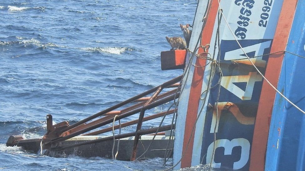 Kediler, mürettabatın kurtarılmasının ardından gemiden denize bir petrol sızıntısı olup olmadığını kontrol etmek için olay yerine giden donanma güçleri tarafından fark edildi. Bir denizci alabora olmuş gemiye doğru yüzerek kedileri kurtardı.