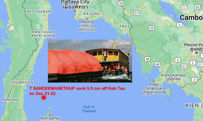 21 Aralık gecesi, kötü hava şartları nedeniyle T SANDEEMANETHUP adlı feribot, Tayland körfezi, Koh Tao'nun yaklaşık 5,5 deniz mili açıklarında, 30 metre derinlikte battı.