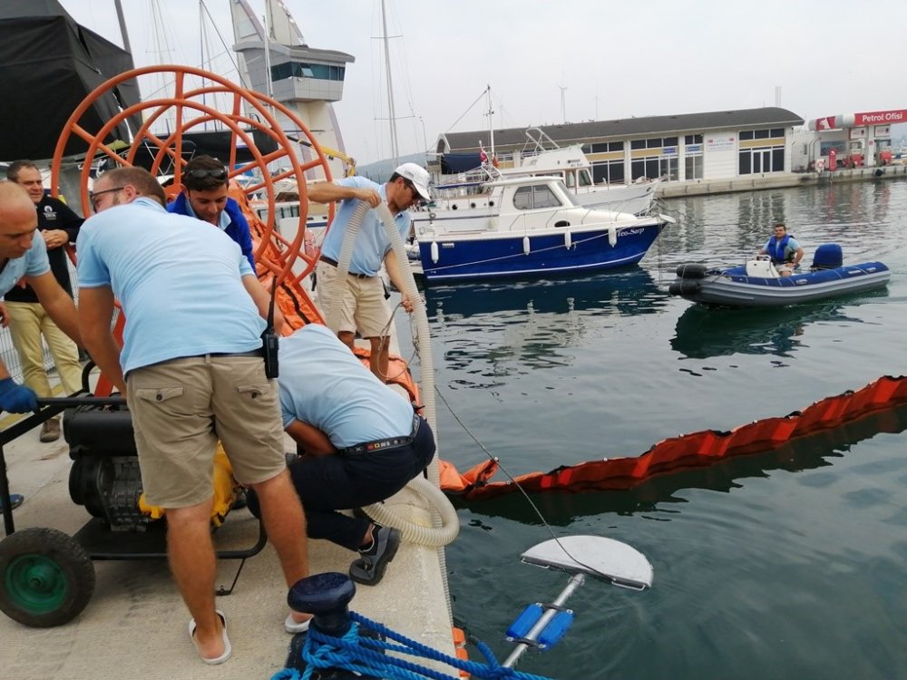 Tatbikatta senaryo gereği, manevra esnasında iskeleye çarpan bir teknenin tankında delinme oldu ve denize fuel oil döküldü. Olayı öğrenen Acil Müdahale ekibi olay yerine gerekli malzemeler ile geldi. Denize bariyer serpilerek petrol sızıntısının yayılmasının önüne geçildi. Bariyer çevrilmesinin ardından, denize sızan petrolü temizleme çalışmasında kullanılacak malzeme kısa sürede kuruldu.