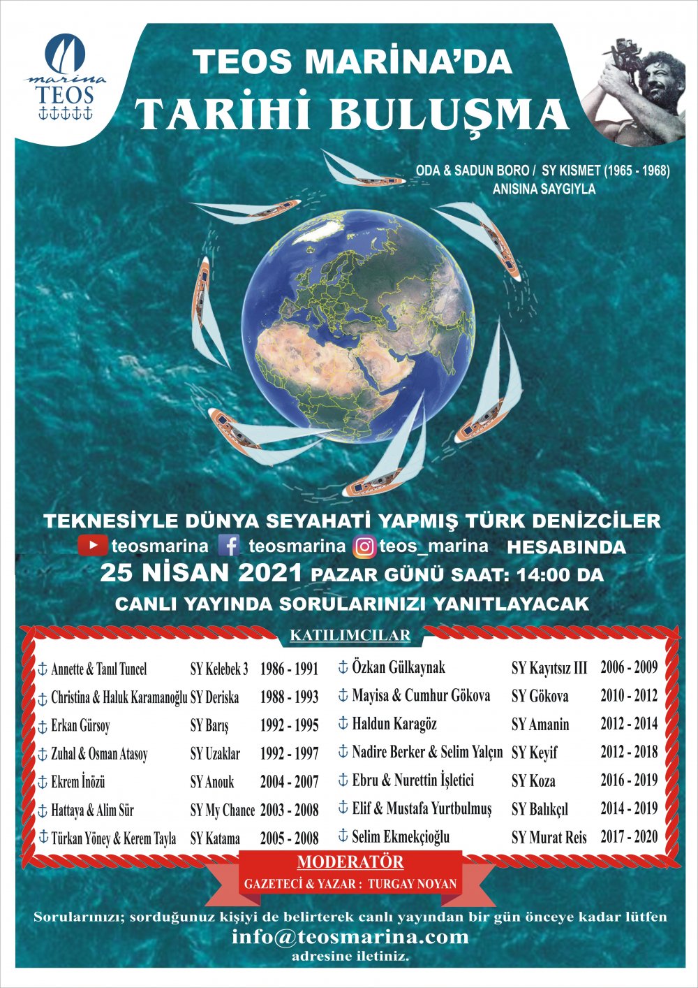 Teos Marina tarihi bir buluşmaya ev sahipliği yapmaya hazırlanıyor. 1965 - 1968 yılları arasında Kısmet adlı yelkenli ile dünya turu yapan ilk Türk denizci Oda & Sadun Boro’nun dümen suyunda yelken açıp dünya seyahati yapmış Türk denizciler, 25 Nisan Pazar günü saat 14.00’te Teos Marina’da bir araya geliyor. Pandemi sebebiyle fiziki dinleyici/ziyaretçi kabul edilmeyecek etkinlik Teos Marina’nın Youtube, Facebook ve Instagram sayfalarından canlı yayınlanacak. Teos Marina çatısı altında buluşacak olan etkinliğin konuşmacıları 14 teknenin ünlü seyyahları, dünya turu maceralarını anlatacak ve izleyicilerin sorularını yanıtlayacak.