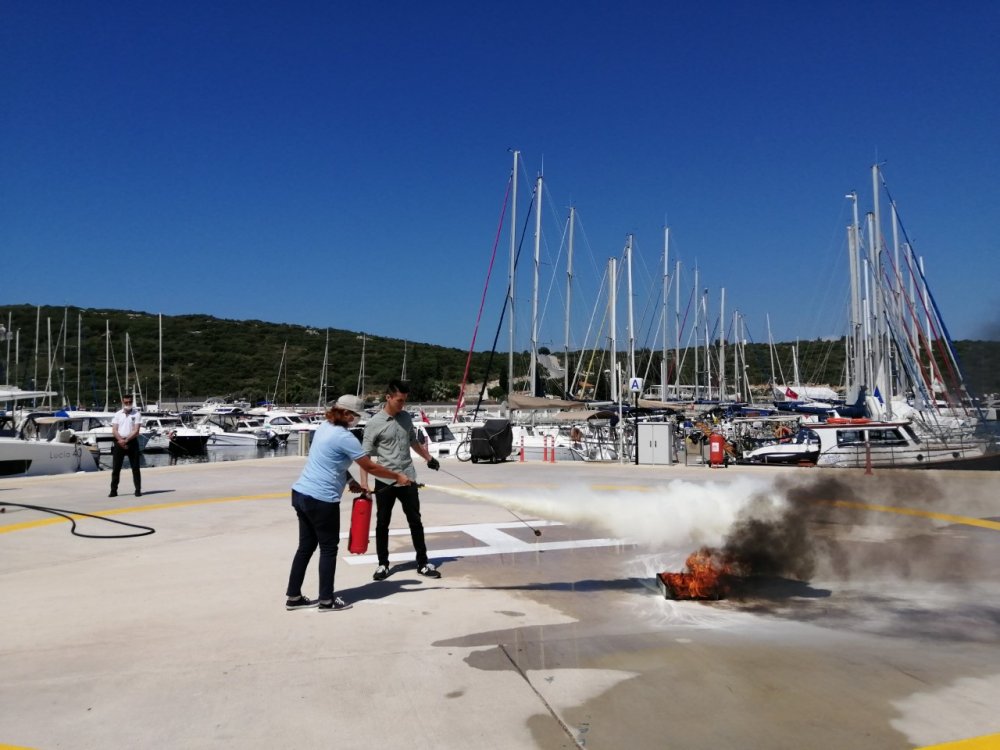 Yıldız Yangın Söndürme Sistemleri San. Tic. A.Ş. firmasından yangın eğitmeni Sezgin Dolu’nun teorik yangın eğitiminin ardından, Teos Marina çalışanları yangın türleri ve tekne yangınlarına müdahale konularında yaşanmış tecrübeleri paylaştılar. Ardından marinanın içindeki helikopter pistinde güvenli bir alan oluşturarak uygulamalı tatbikat gerçekleştirildi. Burada tüm ekip, eğitim amaçlı yakılan ateşe yangın söndürme tüpü ile müdahale etmeyi deneyimledi.