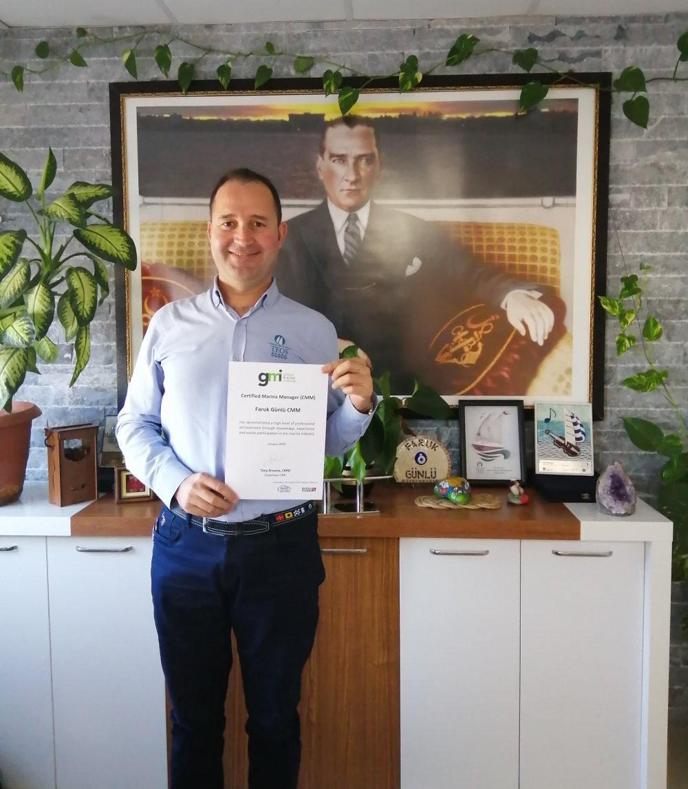 Dünyanın en prestijli sertifikaları arasında gösterilen Marina Yönetici Sertifikası (CMM) almaya hak kazanan Faruk Günlü, 2012 yılında İngiltere’nin Southampton şehrinde katıldığı Intermediate Marina Manager (IMM) kursunu tamamladıktan sonra, 2015 yılında Hollanda’nın Amsterdam şehrinde Advance Marina Manager (AMM) kursunu tamamlamıştı.
