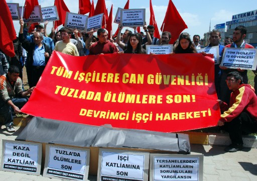 TUZLA'DA TOPLANAN BIR GRUP, TERSANELERDE YASANAN IS KAZALARI SONUCU OLUM VE YARALANMALARI PROTESTO ETTI.