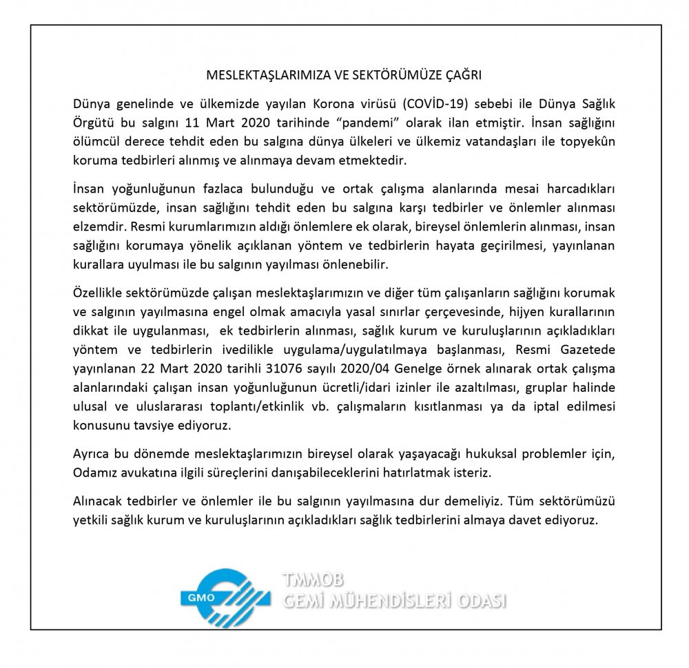 Son dönemde dünyayı saran COVID-19 virüsünün gündeme gelmesiyle, TMMOB Gemi Mühendisleri Odası meslektaşları ve sektörü adına basın bildirisi yayınladı. Bildiride "Meslektaşlarımıza ve Sektörümüze Çağrı" başlığıyla, Resmi Gazete'de yayınlanan 22 Mart 2020 tarihli 31076 sayılı 2020/04 Genelge örnek alınarak ortak çalışma alanlarındaki çalışan insan yoğunluğunun ücretli/idari izinler ile azaltılması, gruplar halinde ulusal ve uluslararası toplantı/etkinlik vb. çalışmaların kısıtlanması ya da iptal edilmesi konusunu tavsiye ederek gerekli tedbirlere uyulması hususuna değinildi.