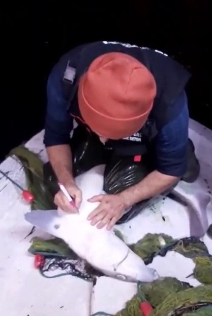Köpekbalığının üzerine tükenmez kalem ile işaret bıraktı