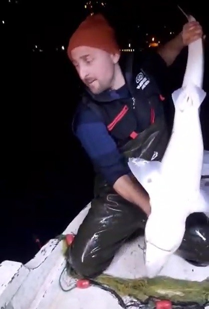 Trabzonlu balıkçı Ali Osman Erçin'in ağına takılan köpekbalıkları ile diyaloğu görenleri güldürüyor.