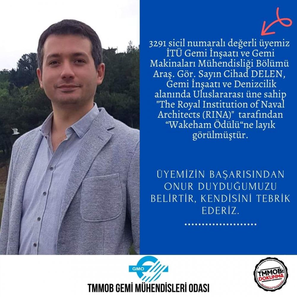 Aynı zamanda TMMOB Gemi Mühendisleri Odası üyesi olan, İTÜ Gemi İnşaatı ve Gemi Makinaları Mühendisliği Bölümü Araş. Gör. Sayın Cihad DELEN, Gemi İnşaatı ve Denizcilik alanlarında Uluslararası bir üne sahip "The Royal Institution of Naval Architects (RINA)" tarafından verilen “Wakeham Ödülü“ne layık görülerek Türk denizcilik sektörünü onurlandırdı.