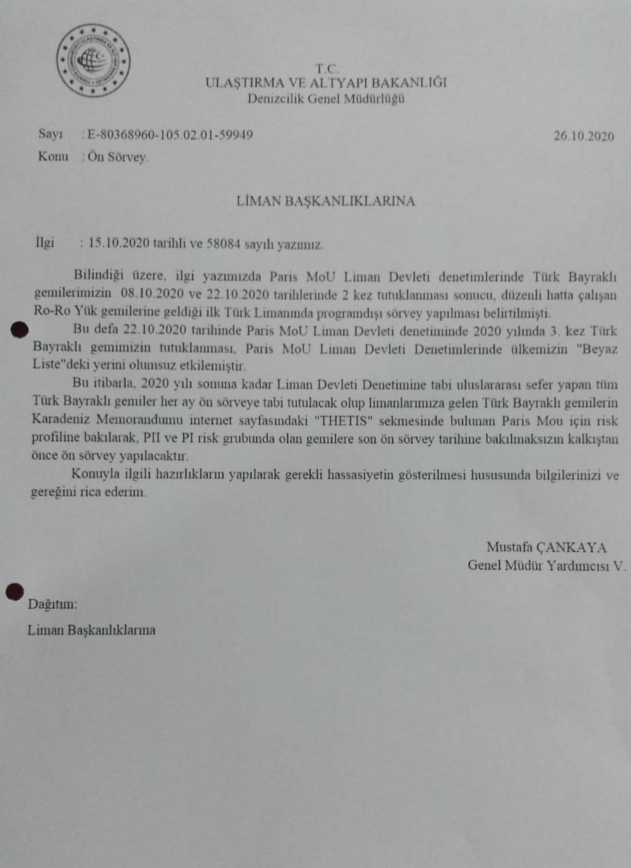 ''Bilindiği üzere, ilgi yazımızda Paris MoU Liman Devleti denetimlerinde Türk Bayraklı gemilerimizin 08.10.2020 ve 22.10.2020 tarihlerinde 2 kez tutuklanması sonucu, düzenli hatta çalışan Ro-Ro Yük gemilerine geldiği ilk Türk Limanında programdışı sörvey yapılması belirtilmişti.