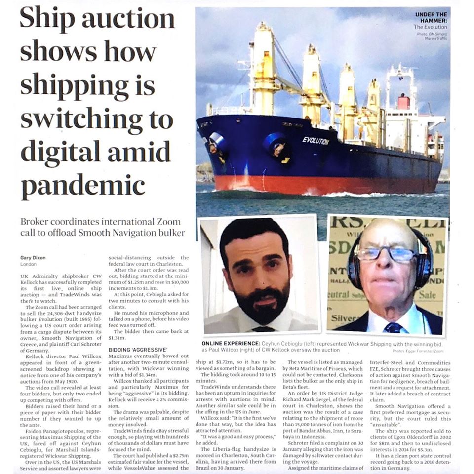 Liberya bayraklı Evolution gemisi Yunan bir armatörün işletmesindeyken borçlarından dolayı Amerika'nın South Carolina eyaletindeki Charleston’da tutuklandı. Charleston Mahkemesi geminin ihale yoluyla satılmasına karar verdi ve satışı gerçekleştirmek üzere uluslararası bir üne sahip olan gemi satış brokeri CW Kellock & Co'u yetkilendirdi. Amerikan Liman Başkanı gözetiminde satış prosedürlerini hazırlayan CW Kellock, Covid-19 nedeniyle ihalenin Zoom üzerinden yapılmasını teklif etti ve bu teklif mahkeme tarafından kabul gördü.