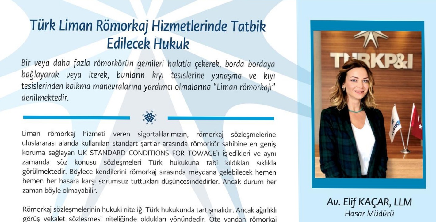 Türk P&I Sigorta A.Ş Hasar Müdürü Av. Elif Kaçar, “Türk Liman Römorkaj Hizmetlerinde Tatbik Edilecek Hukuk” hakkında yazdı.