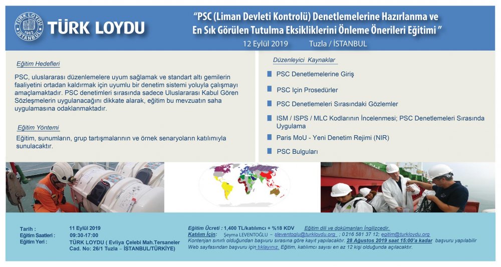 11 Eylül 2019 tarihinde Türk Loydu Merkez Ofisi’nde düzenlenecek eğitim ile katılımcılara Uluslararası denizcilik düzenlemelerine uyum sağlamak, PSC (Liman Devleti Kontrolü) Denetimlerine hazır olmak ve sıklıkla karşılaşılan gemi tutulma eksikliklerini ele almak üzere bilgilendirme yapılacaktır.