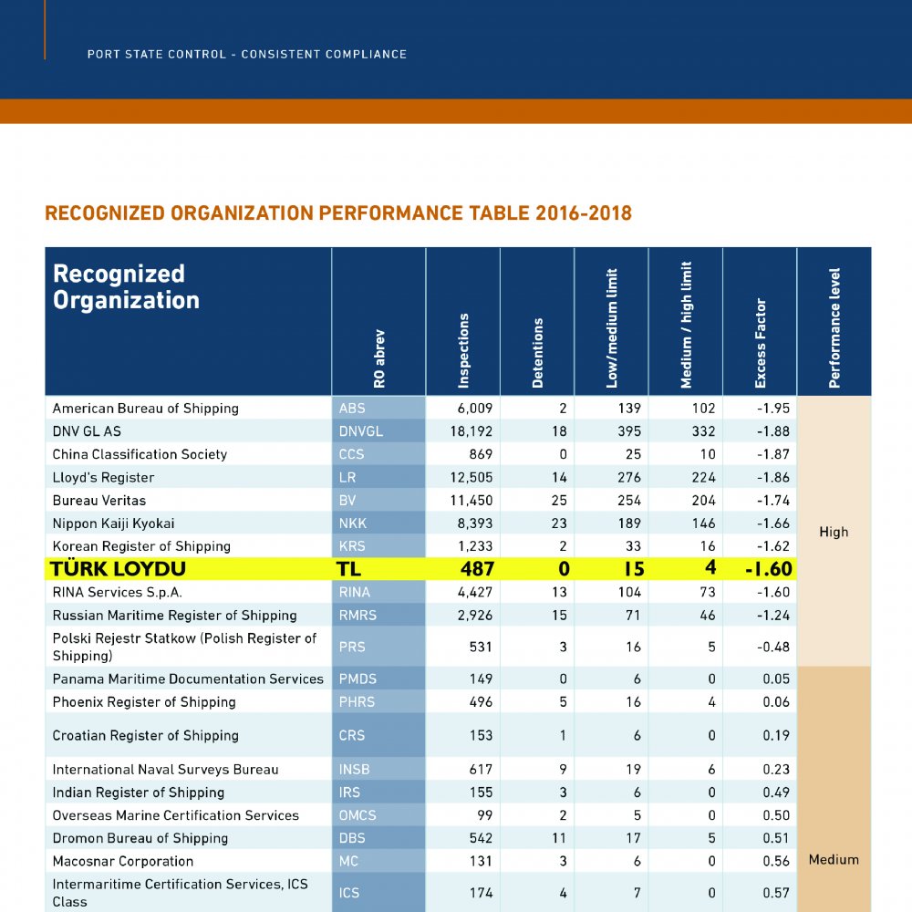 Liman Devleti Kontrol (PSC) rejimleri arasında dünyanın en önemlisi olarak değerlendirilen Paris Liman Devleti Kontrolü Mutabakatı (Paris MoU) tarafından yayınlanan ve 2016 - 2018 yıllarını kapsayan liman devleti kontrol sonuçlarına ilişkin olarak hazırlanan “2016-2018 Yılları Yetkilendirilmiş Kuruluşlar Performans Tablosu” duyuruldu. Türk Loydu son 13 yıldır “Yüksek Performans” kategorisinde yer aldığı tabloda bu yıl bir sıra daha yükselerek, tüm dünyada klas kuruluşları arasında 8.sırada yer aldı. Türk Loydu bu başarılı performansı ile bu sene de bazıları IACS üyesi olan (Uluslararası Klas Kuruluşları Birliği) bir çok uluslararası klas kuruluşunu geride bırakmayı başardı.