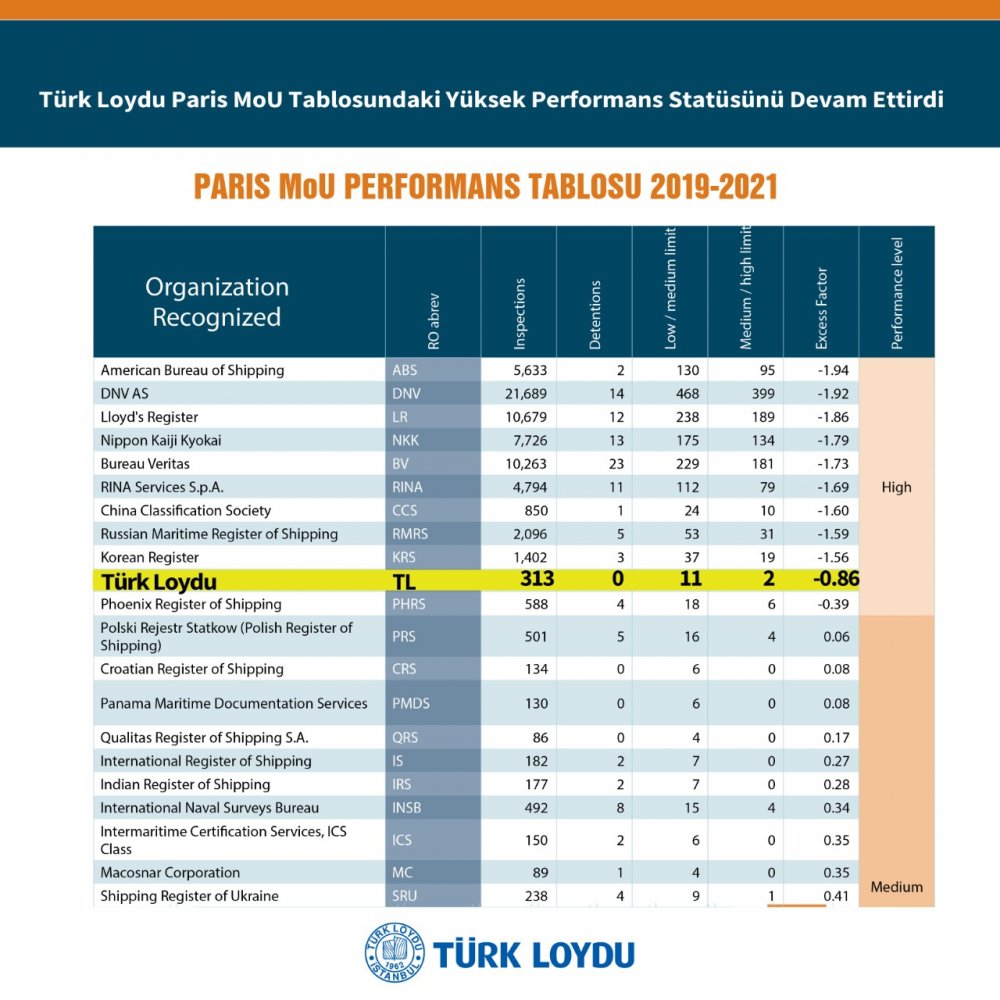 Türk Loydu, Paris MoU tarafından açıklanan Klas Kuruluşları Performans Tablosunda “Yüksek Performans” başarısını sürdürdü. Türk Loydu, son 16 yıldır kesintisiz yer aldığı ve gediklisi olduğu yüksek performanslı klas kuruluşları kategorisinde 10. sıradaki yerini korudu.