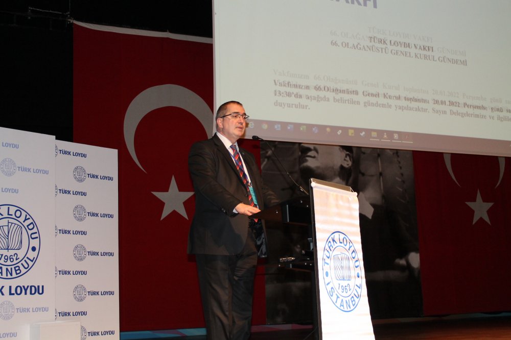 Türk Loydu Vakfı’nın 66. Olağanüstü Genel Kurulu; İMEAK Deniz Ticaret Odası Başkanı Tamer KIRAN, İMEAK Deniz Ticaret Odası Meclis Başkanı Salih Zeki ÇAKIR, Gemi Mühendisleri Odası Başkanı Salih BOSTANCI, Gemi İnşa Sanayicileri Birliği Başkanı Murat KIRAN, Gemi ve Yat İhracatçıları Birliği Başkanı Cem SEVEN, Piri Reis Üniversitesi Rektörü Oral ERDOĞAN, Türk Uzak Yol Gemi Kaptanları Derneği Başkanı Zafer Akbulut, Türk Armatörler Birliği Genel Sekreteri Hüseyin ÇINAR gibi bir çok önemli davetlinin yanı sıra, Türk Loydu Vakfı Yönetim Kurulu Üyeleri, Türk Loydu Vakfı Denetim Kurulu, Türk Loydu Vakfı delegeleri ve basın mensuplarının katılımı ile 20 Ocak 2022 Perşembe günü Piri Reis Üniversitesi Rıdvan Kartal Konferans Salonu’nda gerçekleştirildi.