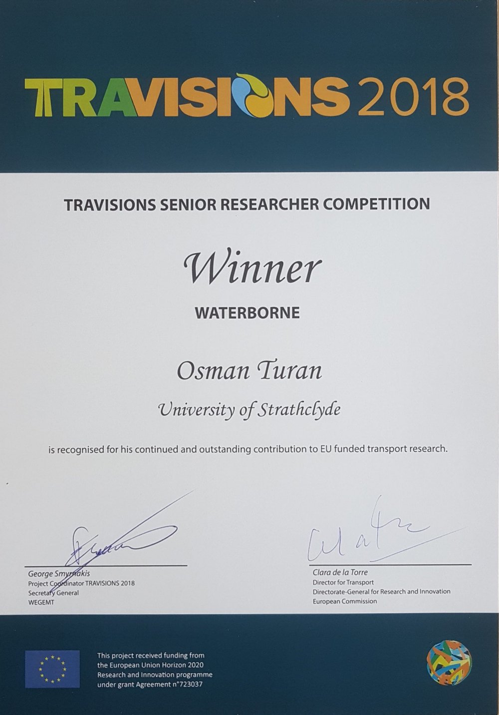 Denizcilik Mühendisliği Bölümü'nden Profesör Osman Turan, AB araştırmalarına ve özellikle de SEAHORSE projesine olan katkılarından dolayı Transport Research Arena VISION kıdemli araştırmacı ödülüne layık görüldü.