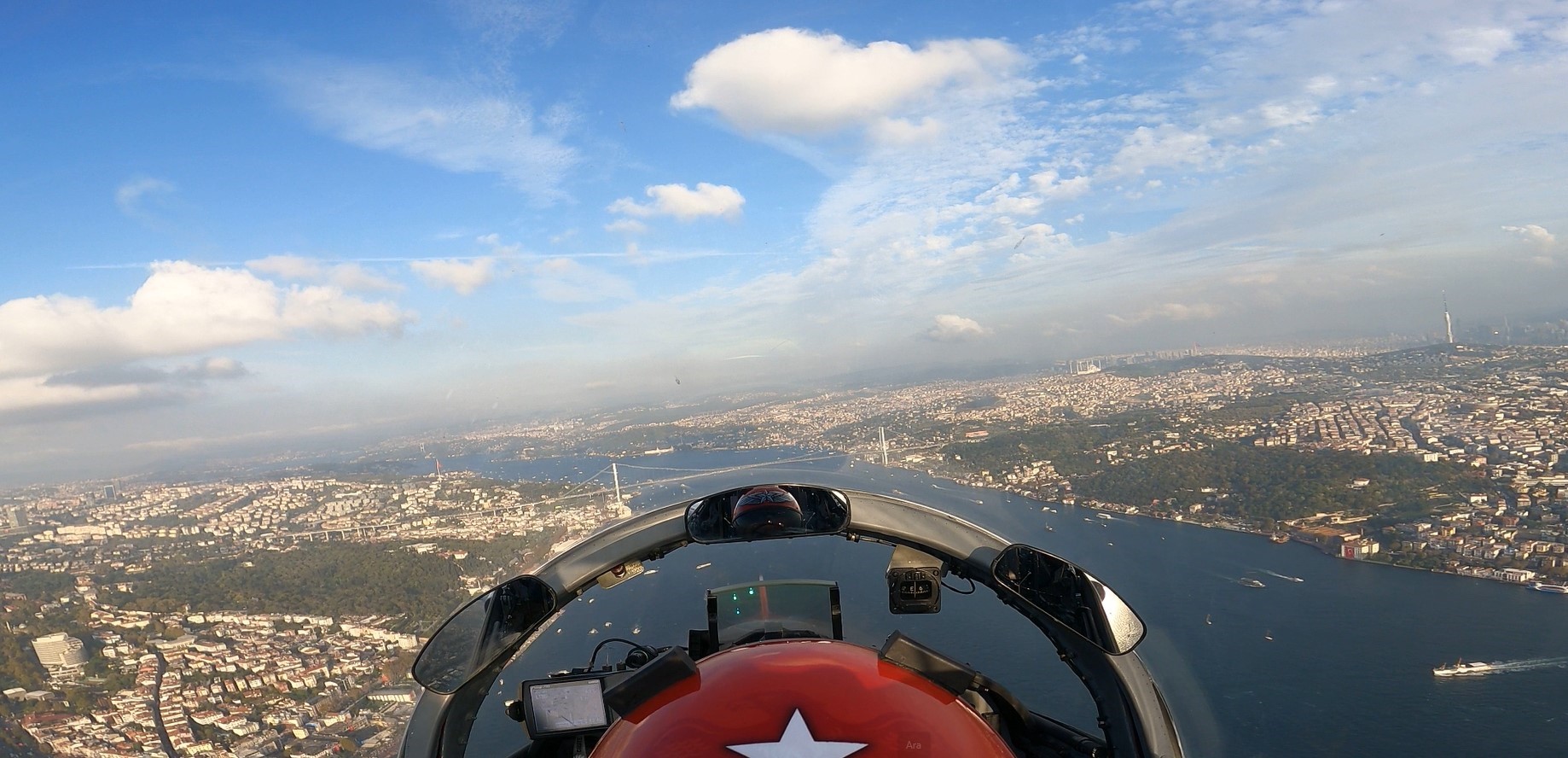 Türk Yıldızları'nın, İstanbul Boğazı'nda Cumhuriyet'in 100. yılı kutlamaları çerçevesinde gerçekleştirildikleri gösteri, kokpitte görüntülendi. Havada oluşan görsel şölen ve İstanbul manzarası bir araya gelince ortaya çıkan görüntü heyecanlandırdı.
